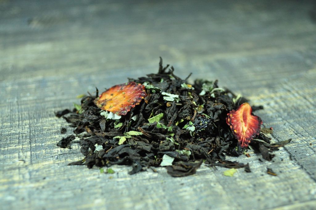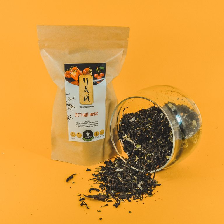 Состав: Черный индийский чай, смородина лист, малина лист, клубника, вишня, с ароматом клубники и вишни