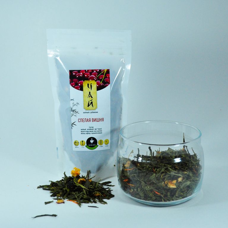 Состав: Зеленый китайский чай "Сенча", вишня ягода, вишня лист, кусочки яблока, сафлор, с ароматом вишни
