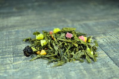Состав: Зеленый китайский чай "Сенча", цукаты, изюм, кусочки яблока, ягоды вишни, с ароматом личи и шоколада
