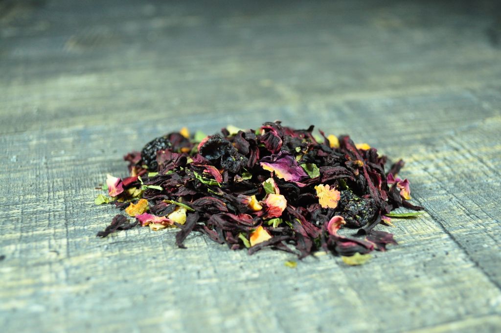 Состав: Гибискус, кусочки яблока, изюм, ягоды вишни, изюм, лепестки розы, с ароматом вишни