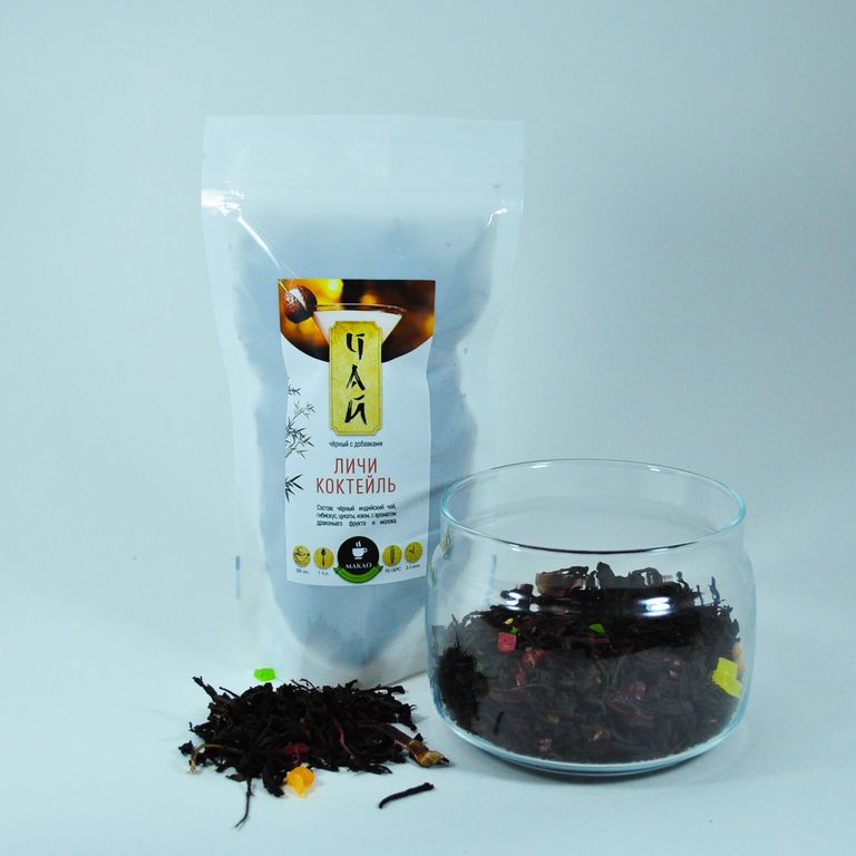 Состав: Черный индийский чай, гибискус, цукаты, изюм, с ароматом личи и молока