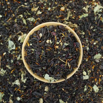 Состав: Черный индийский чай, ягоды вишни, шоколад капли, вишня лист, гибискус, сафлор, с ароматом вишни и шоколада
