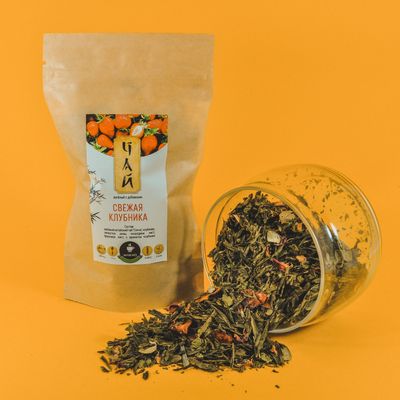 Состав: Зеленый китайский чай "Сенча", клубника, лепестки розы, смородина лист, брусника лист, с ароматом клубники