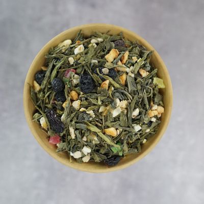 Состав: Зеленый китайский чай "Сенча", цукаты, изюм, кусочки яблока, цедра лимона, ягоды вишни