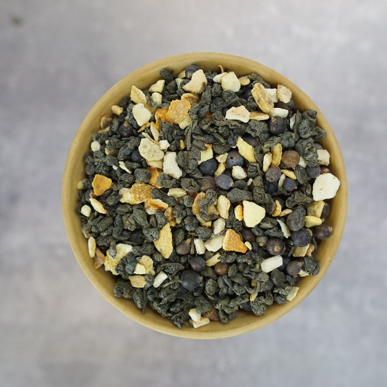 Состав: Зеленый китайский чай "Ганпаудер", цедра апельсина, цедра лимона, можжевельник, с ароматом апельсина
