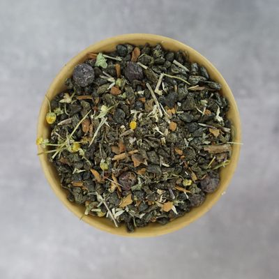Состав: Зеленый китайский чай "Ганпаудер", боярышник, корица, ромашка, душица, с ароматом персика и клубники.