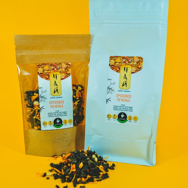 Состав: Зеленый китайский чай "Ганпаудер", кедровый орех, календула, яблоко, с ароматом печенья и лесного ореха