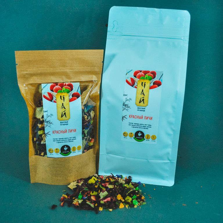 Состав: Каркаде, цукаты, лист гуавы, лист вишни, цедра апельсина, мальва, с ароматом личи и персика.
