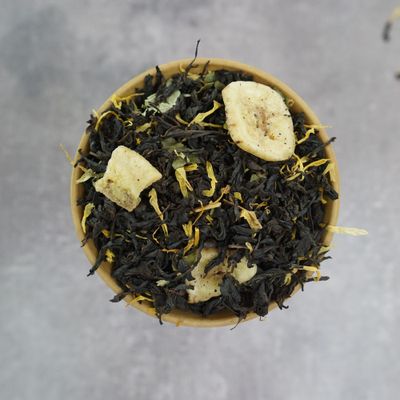 Состав: Черный чай, банан чипсы, гуава лист, шоколад капли, календула, ароматизатор