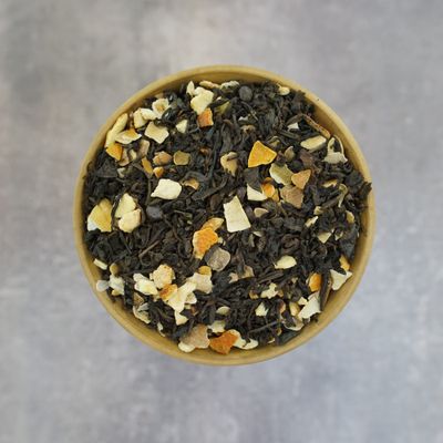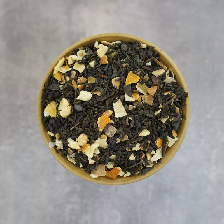 Состав: пуэр дикий, апельсин цедра, лимон цедра, шоколад капли, ароматизатор